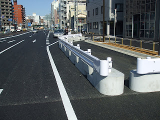 この場所は、近い将来に交差点になる予定の場所で、中央分離帯を構築してしまうと、取り壊しが発生してしまうので、それまでの安全対策としての採用でした。