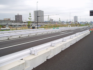 三重県四日市市内の国道1号線で、古くなった橋の架け替え工事に伴い、車線規制をするため、置き式にて自在R連続基礎を採用していただきました。