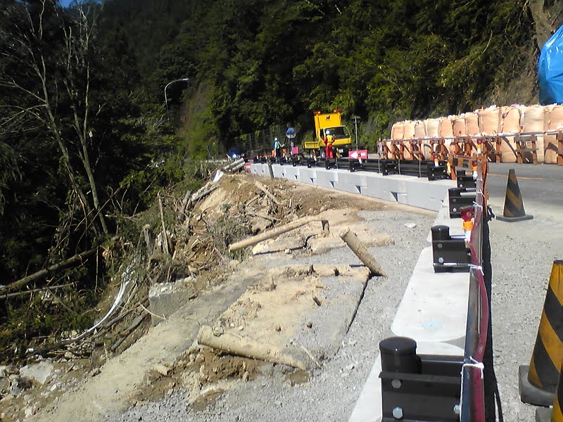 緊急復旧工事により崩落部の補強をし、片側交互通行させるための仮設防護柵基礎として、使用して頂きました。