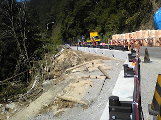 平成23年9月の台風災害により法面の崩落があり、土砂が国道42号を越えてガードレールを巻き込み谷側へ落ち込んだ場所です。