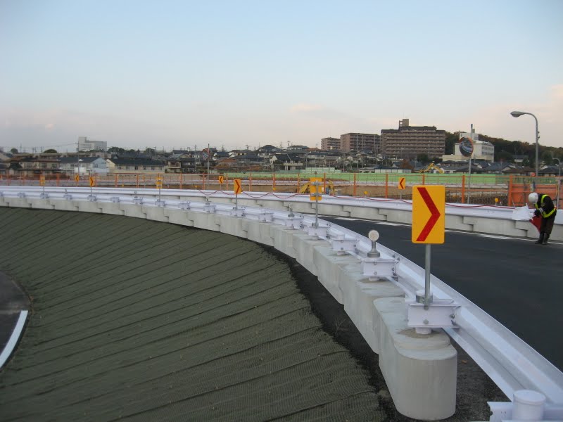 兵庫県 国道29号姫路西バイパスにて、自在R連続基礎(置き式)を高低差のある現場での車両逸脱防止車両への安全対策として、